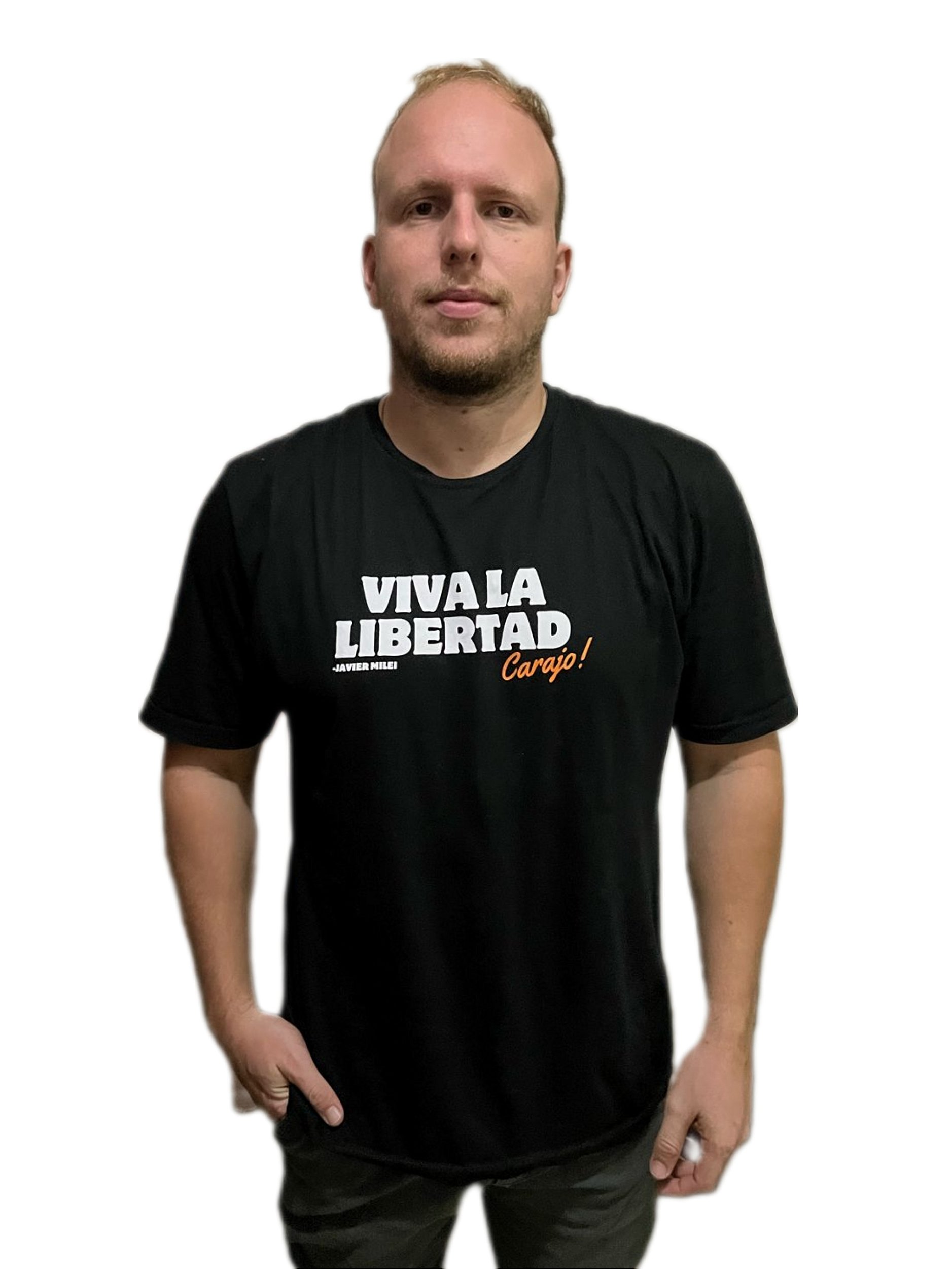 Se prepare para vestir um manifesto pela LIBERDADE! com nossa camiseta "Viva la libertad Carajo" inspirada nas palavras marcantes de Javier Milei.